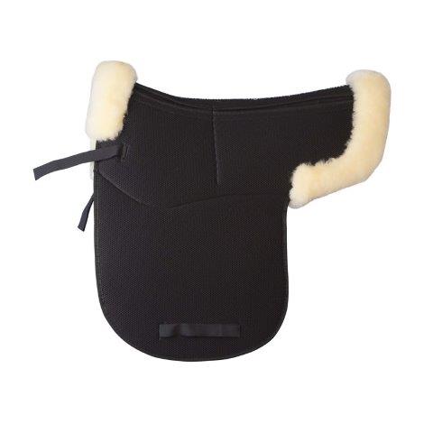 Engel Satteldecke 2 Aufpolster AirTec V-Line Rand vorne und hinten. Diese Serie verbindet bewährte Eigenschaften klassischer Lammfellsattelunterlagen mit den Vorteilen technischer Fasern. Hochwertiger, dauerelatischer Polymerkunststoff ist beidseitig von luftdurchlässigem Meshgewebe umgeben, und durch das Zusammenspiel mit perforiertem Lammfell entsteht durch die Bewegung von Pferd und Reiter ein natürlicher Pumpeffekt, der Ihr Tier deutlich weniger schwitzen lässt. Das Sattelkissen aus Meshgewebe und 100% Merino Lammfell aus Australien mit Fell im Sattelsitzbereich sorgt für optimale Luftzirkulation.