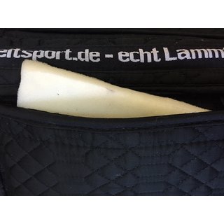 Engel Sattelkissen 1 Aufpolster Rand vorne und hinten besteht aus strapazierfähigem Baumwollsteppstoff und dichtem australischen Merino-Lammfell. Das Lammfell im Sattelbereich hat eine Wollhöhe von ca. 30 mm. Die Ausführung Sakis 1 (Sattelkissen 1) verfügt über einen Fellkranz vorne (Breite ca. 6 cm). Klettbefestigungen und ein hoch geschnittener Widerrist ermöglichen den besten Halt unter dem Sattel. Das Sattelkissen Aufpolster verfügt auf der Oberseite auf beiden Seiten jeweils über 2 Klettverschlossene Taschen, in die werksseitig weicher Schaumstoff ( 100% Polyester Weichschaum) eingelegt ist. (nicht im Lieferumfang enthalten: Distanzgewebe-Aufpolsterung)