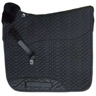 Engel Schabracke 1 Aufpolster Fellkranz vorne Korrekturschabracke mit Lammfellunterseite in der Sattellage ohne Wirbelkanalfreiheit aus strapazierfähigem Baumwollsteppstoff und dichtem australischen Merino-Lammfell. Das Lammfell im Sattelbereich hat eine Wollhöhe von ca. 30 mm. Das Fell im Sattelbereich ist im Bereich der Pferde-Wirbelsäule ist nicht ausgespart. Das kann wichtig sein, wenn bei Pferden mit hervorstehender oder wenig eingebetteter Wirbelsäule und mit Widerrist die Sattelunterlage aus der Einkammerung rutscht (eine durchaus nicht seltene Gegebenheit) und dann mit dem relativ festen Steppstoff das Fell abgerieben wird. Die Satteldecke Aufpolster verfügt auf der Oberseite auf beiden Seiten jeweils über 2 Klettverschlossene Taschen, in die werksseitig weicher Schaumstoff ( 100% Polyester Weichschaum) eingelegt ist. Spezielles Aufpolstermaterial kann zugekauft werden (nicht im Lieferumfang enthalten: Distanzgewebe-Aufpolsterung). Die Ausführung Schabracke 1 verfügt über einen Fellkranz vorne (Breite ca. 6 cm). Klettbefestigungen und ein hoch geschnittener Widerrist ermöglichen den besten Halt unter dem Sattel.