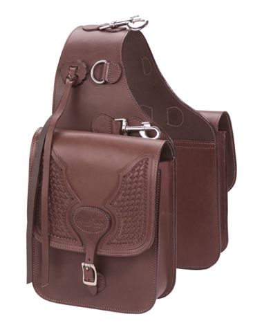 Satteltaschen mit Punzierung. Wunderschöne, doppelte Satteltasche aus hochwertigem, brasilianischem Leder mit von Hand ausgeführten Punzierungen. Das Leder ist geölt und damit wasserabweisend. Die Tasche hat drei Karabinerhaken zur Befestigung am Sattel und pro Seite jeweils ein Paar Lederlaschen, um weiteres Gepäck (Jacke, Decke usw.) zu befestigen. Öffnen und Schließen lassen sich die Taschen einfach mit einer Edelstahl-Rollschnalle.
