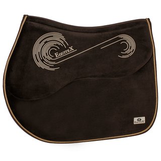 Equitex Olympia Schabracke Springen Grip. Samtgripp aus strapazierfähigem und sehr weichem und atmungsaktivem 100 % Polyester Samt Faserstoff mit innovativem Silikongrip statt Klettschlaufen und weichem, strapazierfahigem Einfaßband mit farblich passender Kordel (auch ohne bestellbar). Im Innern ein Hightech Schaumkern mit Schockabsorbertape-Abdeckung unten und oben mit insgesamt 30 mm Stärke und Seitenteilen 10 mm aus amatmungsaktivem, feuchtigkeitsabsorbierendem, stoßabsorbierendem (PUR-100 % Polyurethan) mit ca. 5 cm Wirbelsäulenfreiheit, Maschinenwäsche bei 40 °, Schleudern bis 900 Umdrehungen.